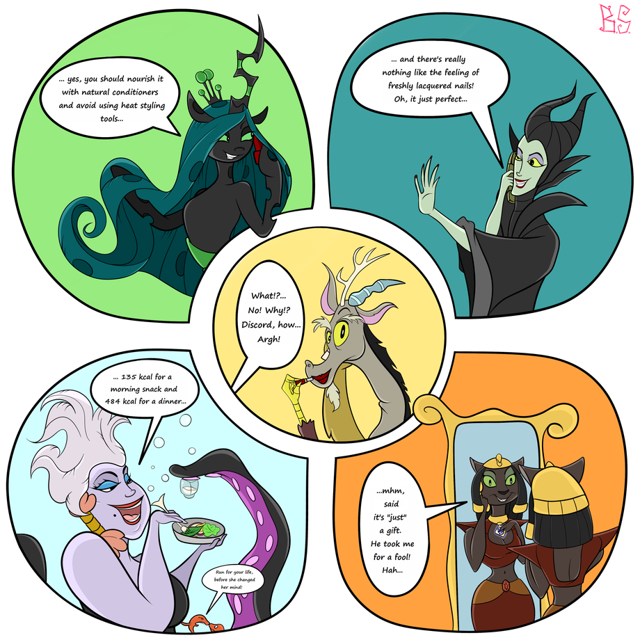 Queen Chrysalis, Discord and My Little Pony: Friendship is Magic belong to Hasbro. Maleficent, Ursula and Mirage belong to Disney.