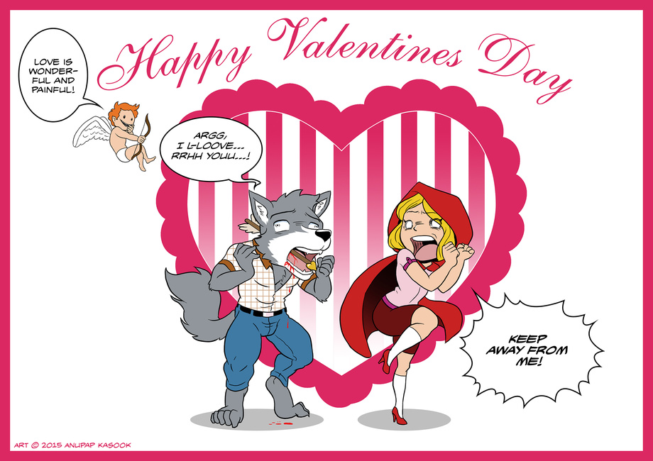 Cupid shot with his arrow to the Big Bad Wolf's head and the Big Bad Wolf is fall in love (half dead) with Red Riding Hood. And she is shocked.