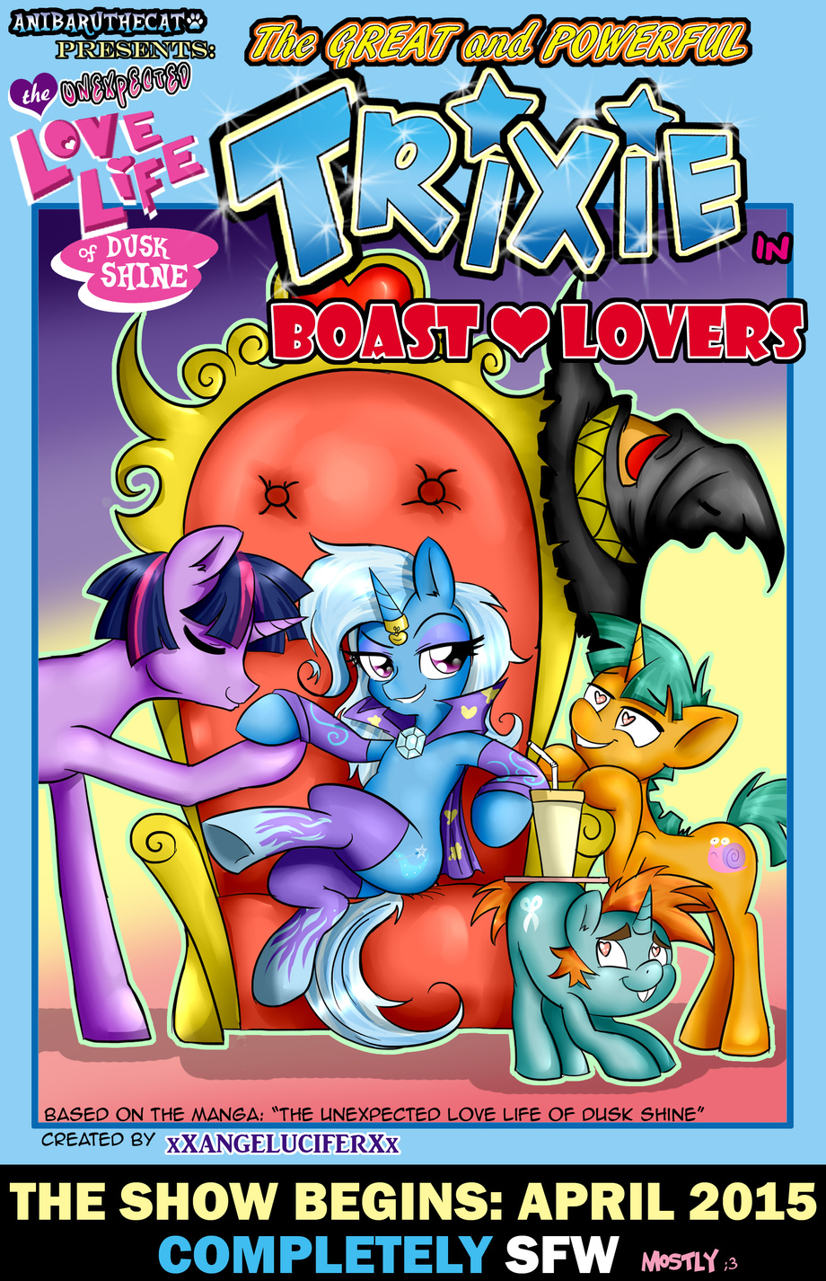 Some months ago I begin to create my own story, instead start from the begining I decide to initiate with a different arc a little forward in the story: the Boast Busters episode where one of my favourites ponies appears for very first time THE GREAT AND POWERFUL TRIXIE, I always wondered how it will come if she cross paths with Dusk Shine and instead an enemy she find a cute and appealing prospect :D Sooo... I contacted the author and ask permission for use his designs of the main six (If you have seen the manga you will agree with me those are grogeous) He said no problem with that :) Anyway I've been delaying this project for so long, most of my other commissioned comics are done and those wich not soon will be. that's why I must start this before bury myself in more work. This doesn't mean I will cancel any of my current comics: Double Trouble, Gang Bangerz, After Classes and of course Cat's Delicacy will continue be sure of that. But I wanted do a sfw comic since the last year and I gonna take this opportunity :3