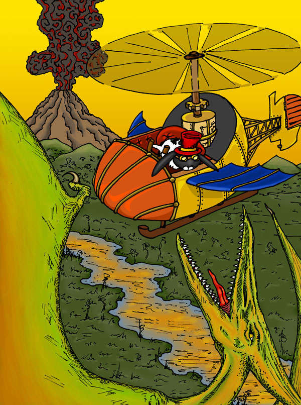 Cookie, the disapproving rabbit, finds herself on an epic time traveling steam punk adventure in this commission for the February cover of Imagyro Magazine.