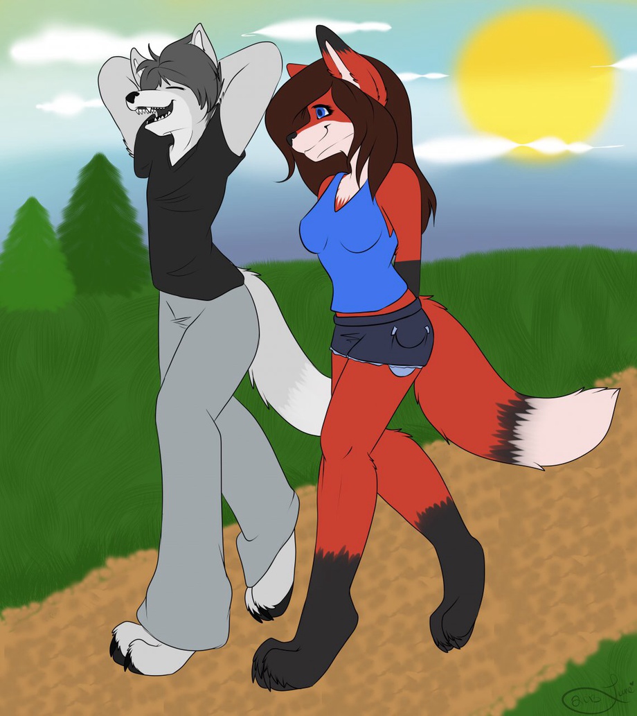 Kyle and Reina are having a nice stroll through the park chatting and having fun as the walk down the trail.
