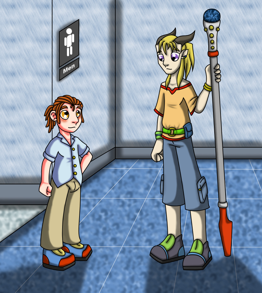 Takumi sighed and shook hsi head following after him at a slower pace but his longer legs keeping him close. He stopped outside the bathrooms and waited for the Dwarf. Kalder had some incontinence issues since childhood and Takumi was one of the few people who knew. The Qunari himself had had night time issues himself and much to his embarrassment as well sometimes still did. The shared problem helped bring them together. And provided for some fun now and then with a bit of role playing. It was quite easy for Kalder to fit his particular role. Clothes for human kids fit him perfectly after all given the Dwarf's size. A few minutes later Kalder walked out with a sigh.