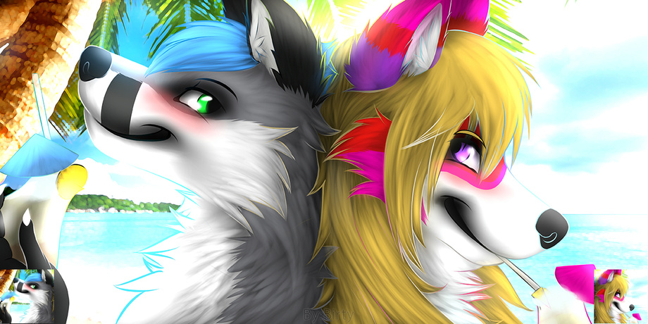 Here you see Takum and Solar relaxing on the beach back to back enjoying a nice drink. Could the blush be from the drink, No one knows. >:3