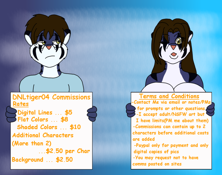 Here are my new commission rates. I may make an alteration to this menu and add examples to the pic, too. I decided to haves some fun with Addy and Andi this time; Addy just doing his job and Andi flirting with people going by the old 'Sex Sells' kind of thing. Please Enjoy.