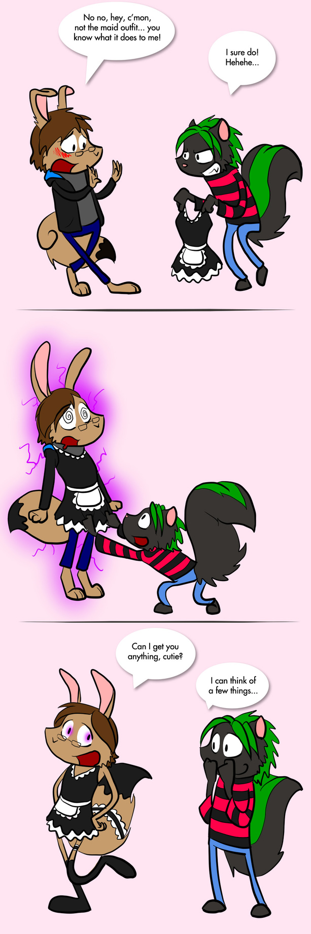 One of the original hypnotic triggers Immelmann discovered had been mysteriously implanted into his brain was related to a maid's outfit. He found that he was cheerful, prone to cleaning, and very... obedient. He could not resist doing absolutely anything ordered by the person who put it on him (barring life threatening orders, of course).
