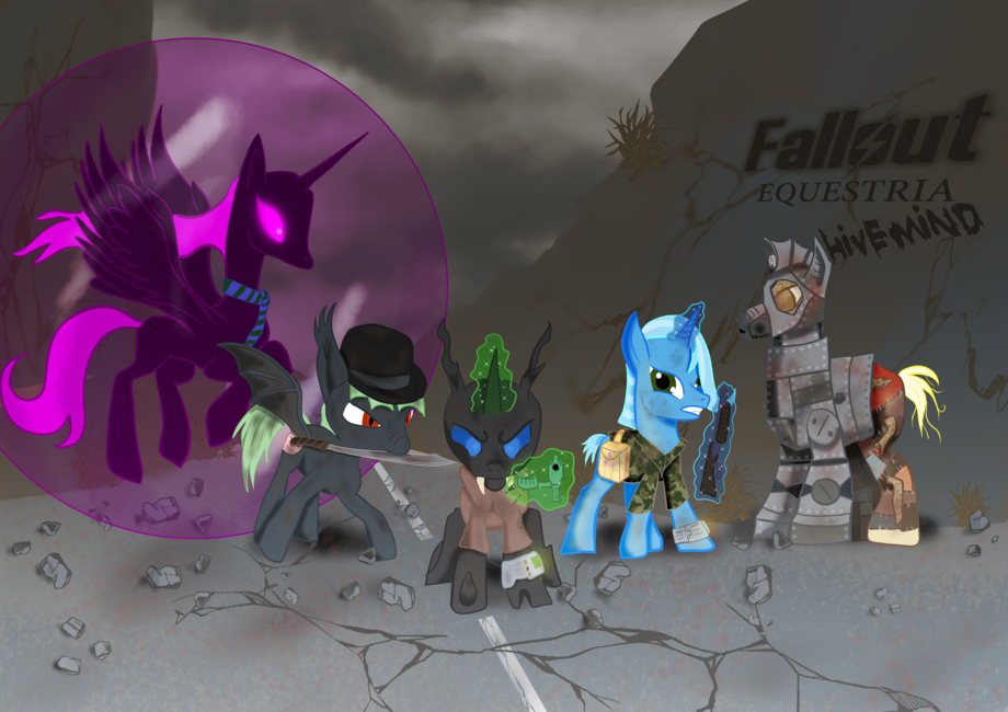 Meet the cast of Hivemind. From the left, Serenity the artificial Alicorn who is prone to panic attacks when she does things she thinks she shouldn't have, Emjay a batpony former slave and now a fuzzy ball of hate and self loathing, Hero the changeling whose developing a personality, Misty La Moon the unicorn medic who is out of her depth, and Tidbit an earth pony ghoul who has been building his own ranger armor from bits and bobs. You can read all about their adventures http://www.fimfiction.net/story/105610/fallout-equestr...