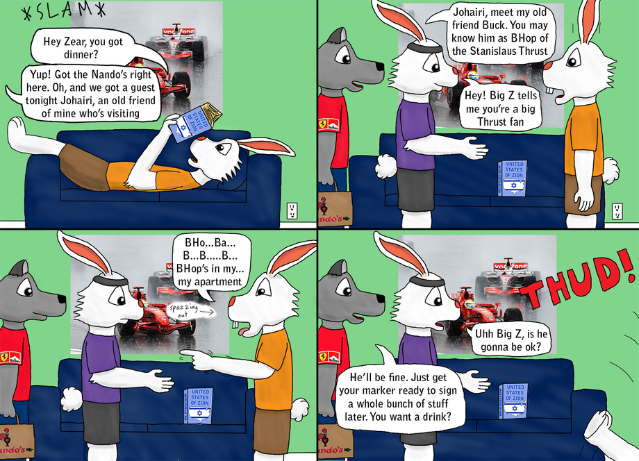 Johairi is a BIG fan of the FBA Thrust team, particularly BHop. The guy has tons of Thrust merchendaise and even keeps an autographed 8" x 10" glossy framed in his room. You can imagine his reaction when the Bunny himself shows up in his apartment and what's more, zear knows him personally!
