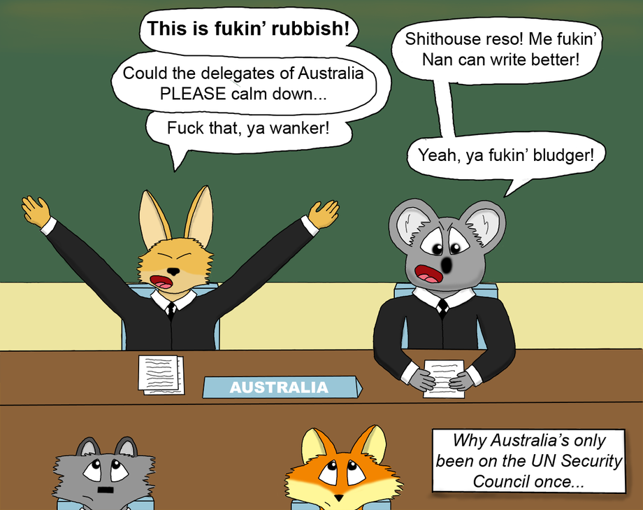 This is probably what the delegates of Australia are like in the UN meetings! And I should know, being in a school chuck full of 'em that they're profanity prone, and it rubbed off on me. You got a fuckin' problem with that?
