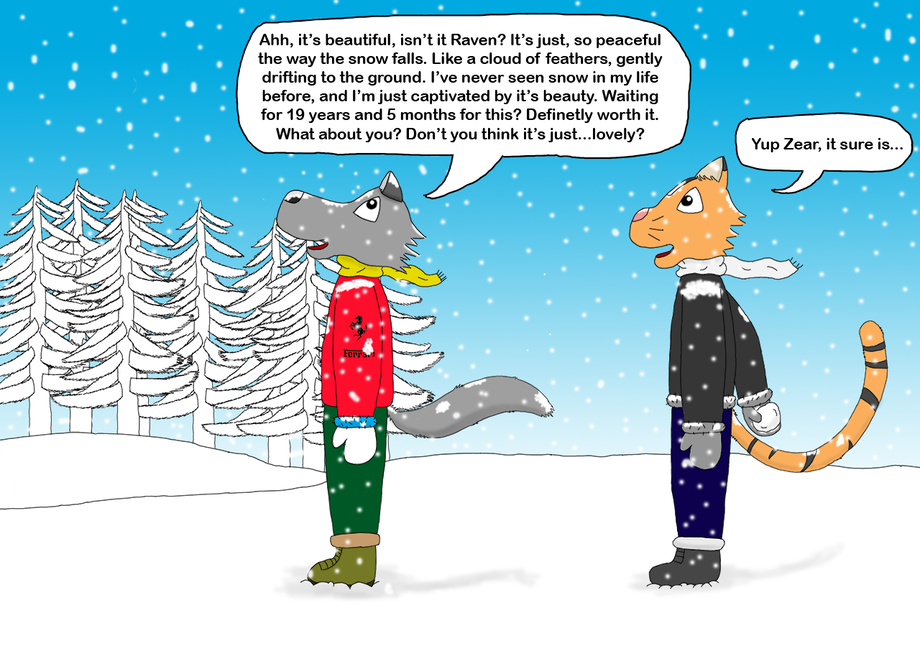 Zear and Raven are out in Osheyda park, outside of the city near the green mountains, enjoying the snowfall. While zear marvels at the poetic beauty of the snow, having never seen snow before in his life, Raven has a more practical appreciation of the snow...