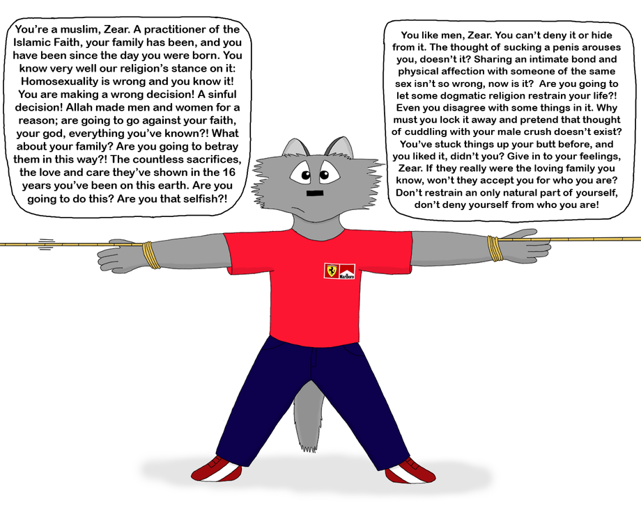 Now I feel the tug of the religion side, knowing full well that if they ever found out, I would very likely be cast out, shunned from my family, and my family is very close. My cousins are closer to me than my best friends. I'm just...caught in the middle of two forces, tearing at me.