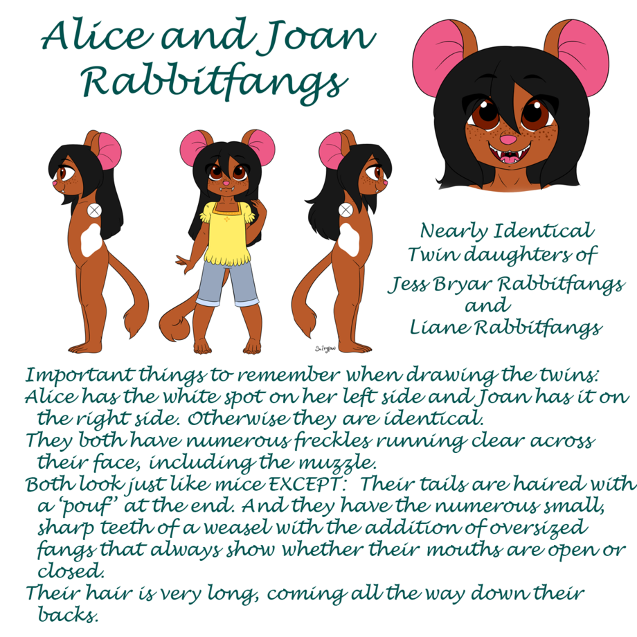 Introducing Alice and Joan Rabbitfangs, the (nearly) identical twin daughters of Jess and Liane. At the tender age of six, these mouse/weasel/rabbit hybrid girls are already quite the handful, and ready to take on the whole world! Right after a few cartoons...