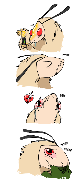 When he gets nervous, he tends to nibble and frequently it's his own creations! Moff exclusively eats fibrous foods, and this can include clothing.