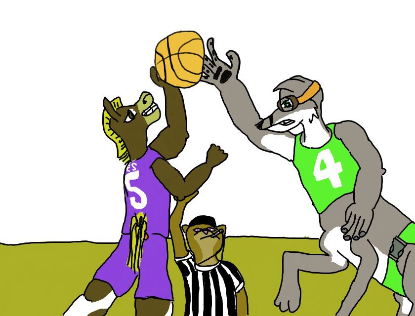 Center for the Stanislaus Thrust (in purple), Billy Joe James #55, seeming to have the edge of the tossoff between himself and Edward "Four by Four" Nicoles #4, a fox'taur center for the Jousters. On his hindlegs, Nicoles tends to tower over any other player in the league, and performing dunks isn't much of an issue, the problem is trying to keep control with all that weight on his hindlegs isn't easy.