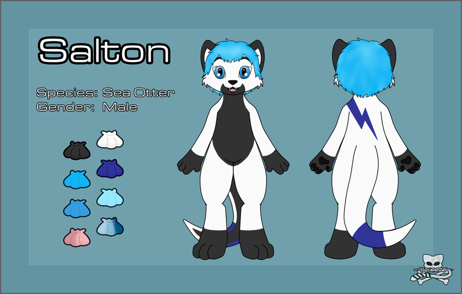 Black and white otter, Lightening bolt down the back with a striped tail, and blue messy hair