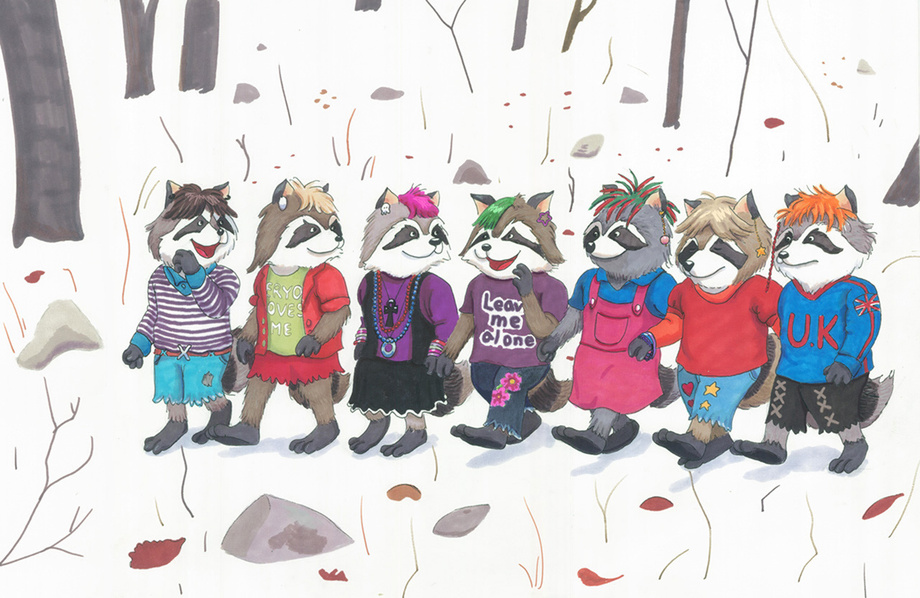 So I took 7 of my own 'coons and drew a pic 'round the poses of the girls in the original pic.