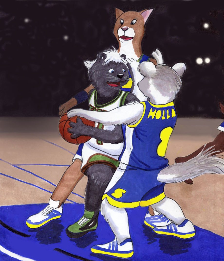 An FBA pic I did for my own amusement. Angelo Dolph (the skunk) of the Plymouth (Mass.) Taproots being hemmed in by Karl Gruber (back) and Telki Holland (front) of the Spectrums.