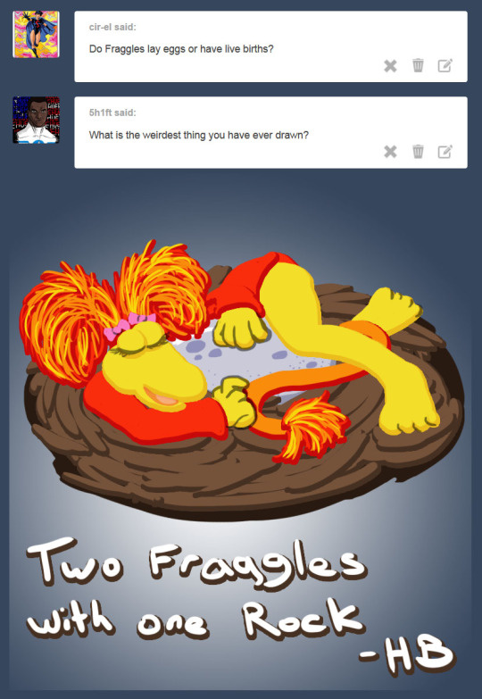 All joking aside, I’m pretty sure Fraggles have live births as opposed to hatching from an egg. I doubt their fuzzy snouts would be capable of breaking free of the shell, and their vulnerable eyes could be harmed in the process. As for the weirdest thing I’ve drawn, it would likely be a request I drew that was extremely high concept. The character was supposed to be wearing cowboy clothing during a gunfight, but her opponent’s bullets were stripping away her clothes in a way that made her look childish. It was some sort of mixture of a humiliation and age regression fetish, and very difficult to capture with a single picture. It was bizarre to say the least, no offense intended to the original requester.