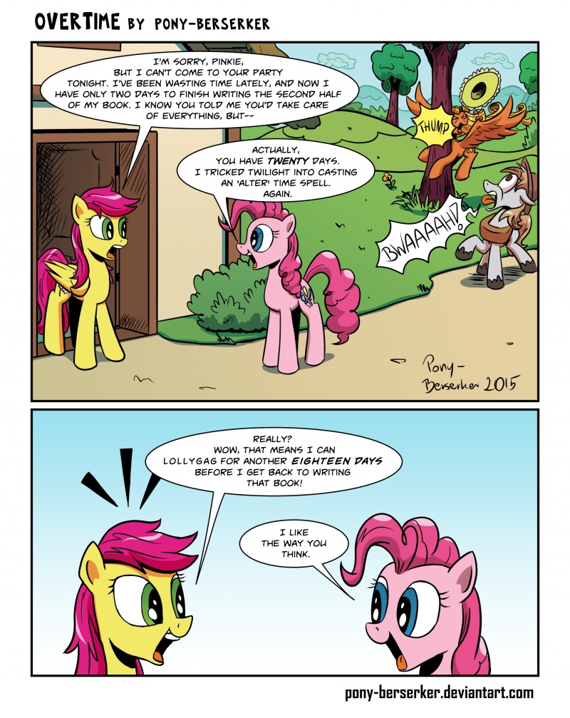 So...as you may or may not know Sweet Words is an author of a book series for foals. She also enjoys nothing more than putting off her work tell the last minuet. It just so happens she also enjoys parties and has found a great partnership with a certain pink pony.