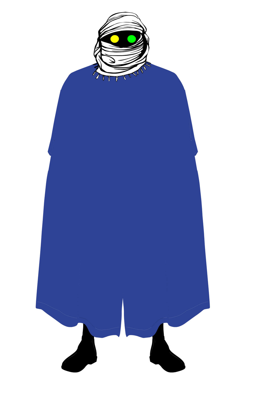 white lab coat, gold cape with green lining to symbolize Gold and Cash. and a Gold crown with emeralds to symbolize his superiority.