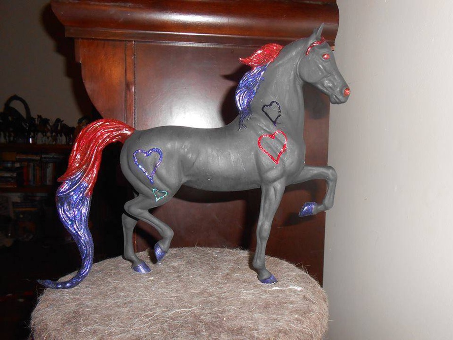 My Gaited Harliquinn mare Hearts Abound. A Breyer model I re-did to look like this. She is mixed media. I used Acrylics for her black coat and purple and red glitter glue for her mane, tail, forelock, and hooves, and other colored glitter glue for her hearts. She took about 4hrs from start to finish. She hasn't been sealed yet, but will be doing that next month.
