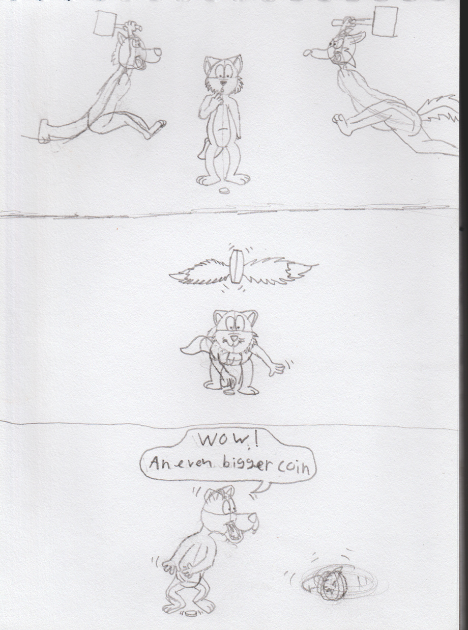 They are working together here and pouncing on an unsuspecting toon who has seen a coin on the floor. He bends down just in time to pick it up, making Jaga and Omega miss and slam into each other and flatten into discs. The toon sees them spinning around and thinks they are an even bigger coin.