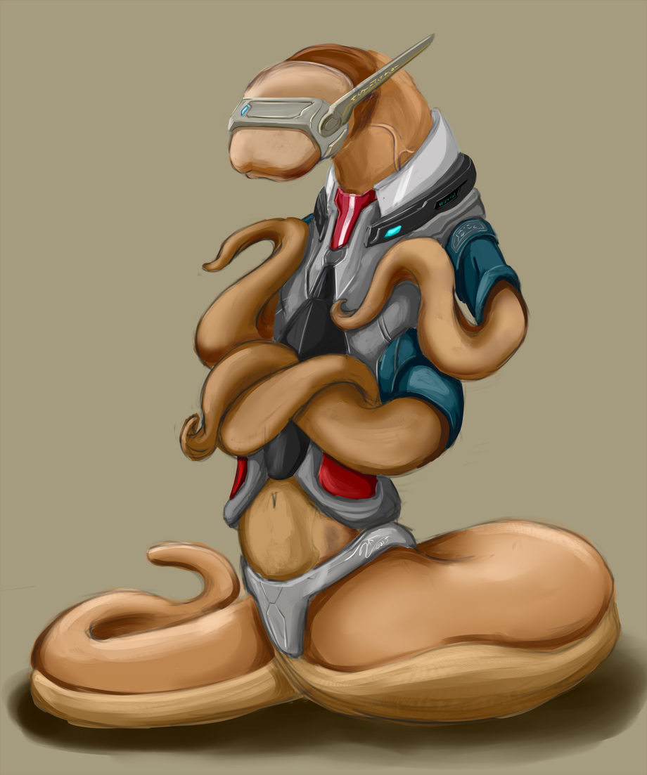 New character ya'll. This is Apofys, younger sibling to Gorlan. Why do they look so different? He's in second life stage while Gorlan is in his 3rd stage. The visor sends visual data direct to his optic center because his eyes haven't fully developed properly yet. and Yes, the little panty looking thing protects the orifce where his bits are. He's a ships engineer. I know it looks like he's wearing a tie but its not.