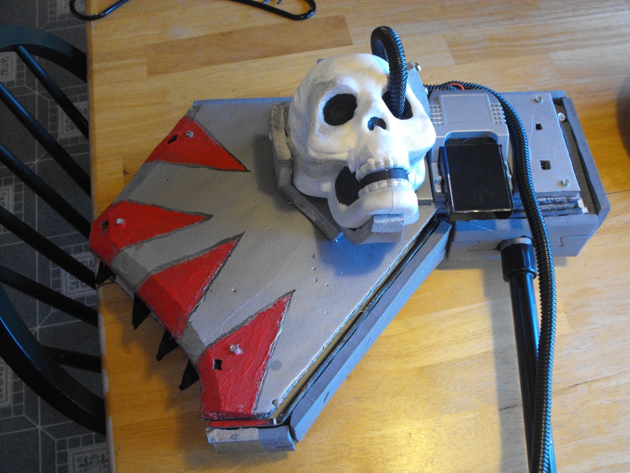 A note to GayHare: It looks good. But if you can, you need to do something to make the haft look cruder. Maybe just a mix of duct tape and electric tape lumps. Or build a foam rectangle around it and add paint and rivets to match the grip.