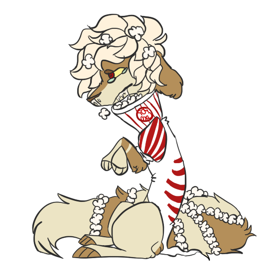 A string of popcorn wrapped around his tail and stray popcorn scattered about in his hair.