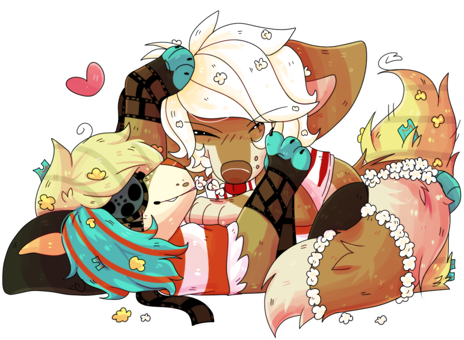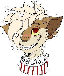 A string of popcorn wrapped around his tail and stray popcorn scattered about in his hair.