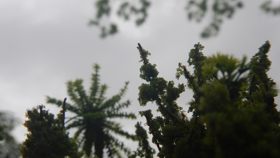 The car is a detailed model meant for an HO scale train board. The car model is around $20. The small trees are train board trees that came in a pack of about 25 of them. The small mountain in the background is a wood fence overgrown with vines. The palms are made from tiny miniature plastic ferns glued to a small stick with a hot glue gun. For the fan palm, miniature plastic leaves that were the shape of fan palm fronds were used. The plastic fronds came as plastic hanging plants from a Micheal's Art Supply store. All of it was set up on a sand pile.