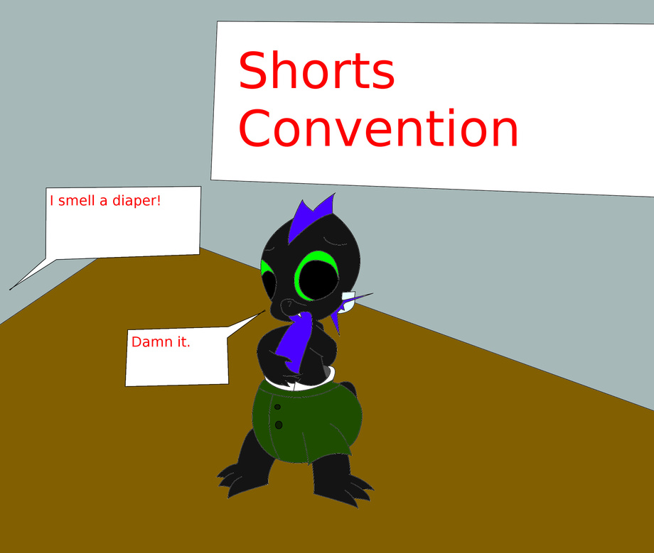 First they had me infiltrate a Pull Ups Appreciation day building, now they have me undercover at a shorts convention. The fact that my shorts would rip if I even slightly tilted forward was bad enough. However, the fact that my diaper was used and bloated forced my legs apart, making it very difficult to walk. And once again, I cannot get a change as it would blow my cover and I couldn't bring a gun in. Waddling around the building like a baby (Which I am) was rather suspicious.