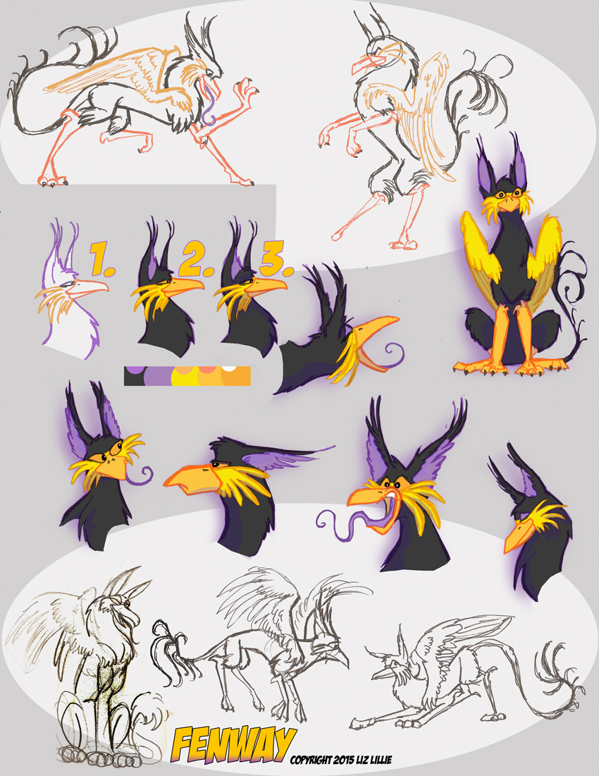 One of Liz's personal characters- Fenway finally strutting his stuff in a nice model sheet. Created when she was 11 and these drawings were sketched in college, she found the name 'Fenway' in a dog magazine, not realizing it had other locations.
