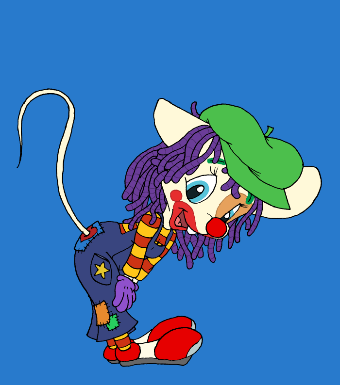 Okay, I'll admit it: clowns are really damn fun to draw. I've always liked putting characters I love into unexpected costume changes, and with clowns I get to put in a lot of detail and use colors I don't often get to use in other pics. (Rodents in general do not come in a cornucopia of colors.) Anyway, I just got this image of Gadget in a kind of kids' show type clown outfit with overalls and a striped shirt and big floppy beret, and thought I'd try to draw it.