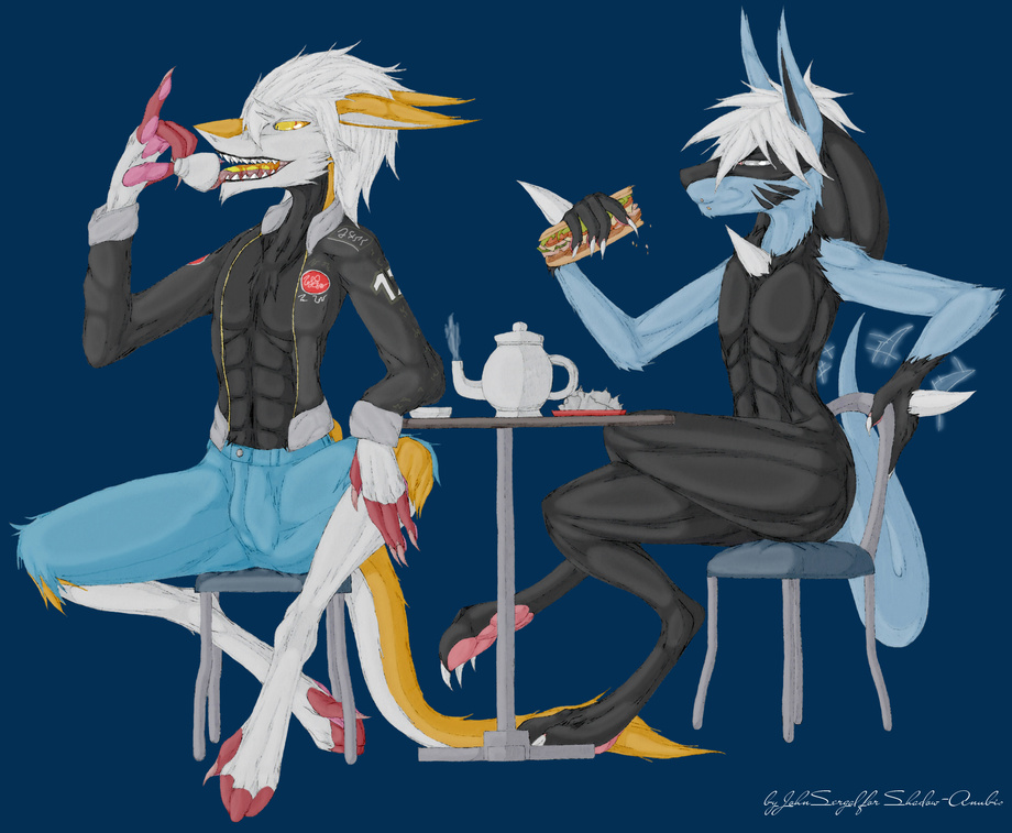 Gift for a friend http://www.furaffinity.net/user/shadow-anubis/ Easy meeting with Anubis, in the cafe. John drinks green tea, and Anubis his big breath-taking delicious sandwich. For some reason he is naked and staring at John, his tail indicates Interesting thought.