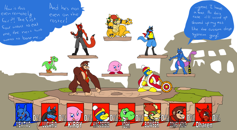 A long time ago, I traded dragga a WiiU in exchange for its fair market value in artwork; I ended up adding a little bit after the fact to make up the difference on this piece. Given my reason for finally owning a WiiU was Mewtwo's return to Smash, it's fitting that the last - and certainly most involved! - piece he did for me involved exactly that.