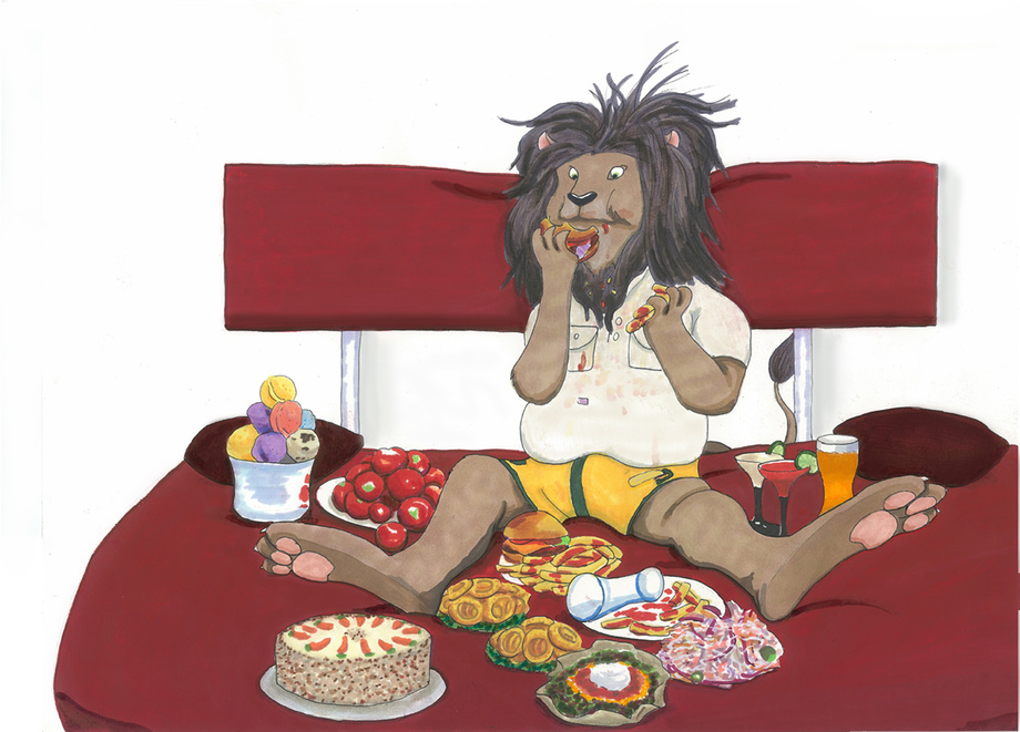 The spread this lion's got before him was inspired by an actual, apparently typical, dinner eaten by writer Hunter Thompson every evening at the local restaurant. :O