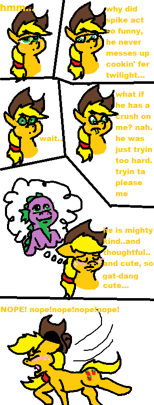after the events of spike at your service, aj ponders why spike screwed up so badly. she' realized maybe he has a crush on her, but she shoots it down thinking he was just trying too hard to please her cause of the dragon code.