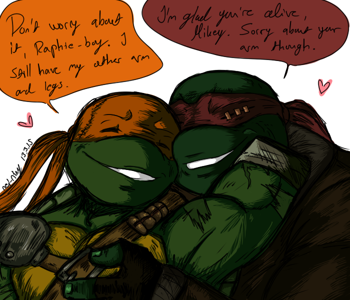 T___T Sorry for the late reply!! I feel bad that people do so much sad / not happy arts about SAINW. I mean there's this happy moment when Donnie came back and managed to get the brothers together. There was moments when they were smiling and stuff. But I will keep doing happy arts about SAINW turtles (and I actually could draw something about them soon!)