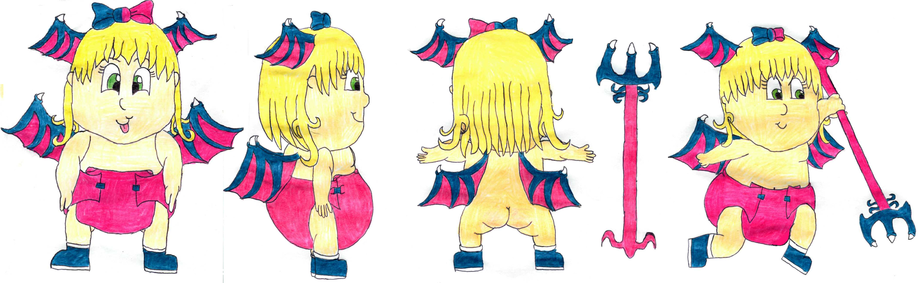 She is 3 years old and still loves to wear diapers despite just learning about the potty. Her favorite colors are Navy Blue and Magenta cause she was born with those colors and loves to sport them in her clothes like her diapers, boots, and bows. She weilds a pitchfork that was tailor-made by her dad to help her fight off against invading castle-dwellers. She is quite handy with it being able to spin it at great speeds and throw with her left arm.