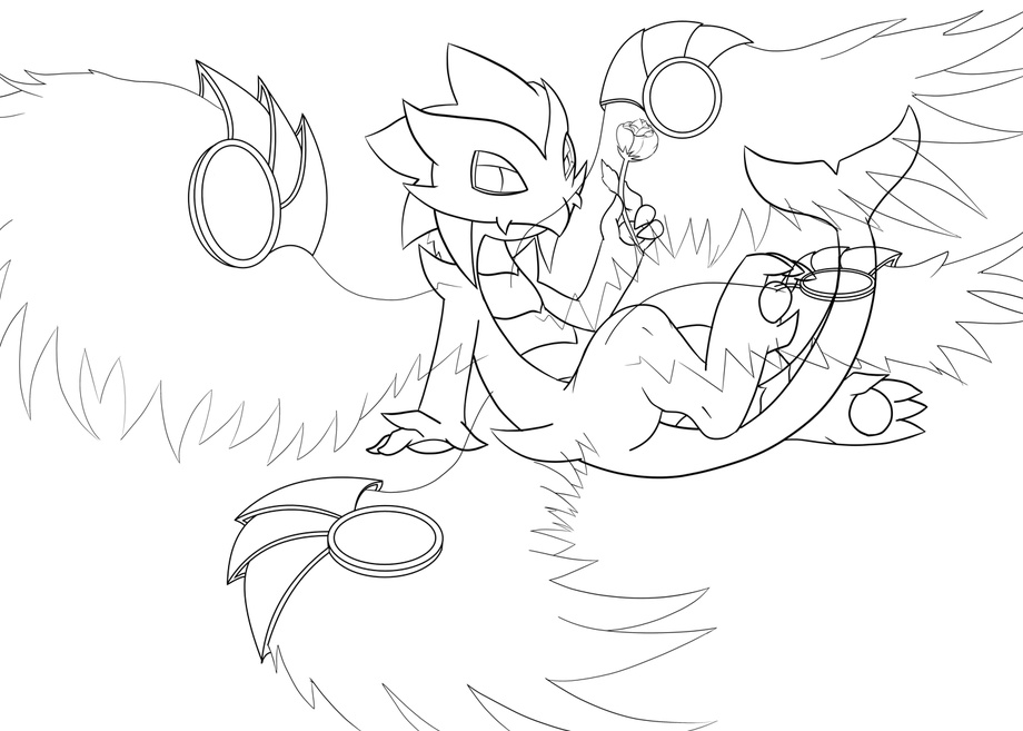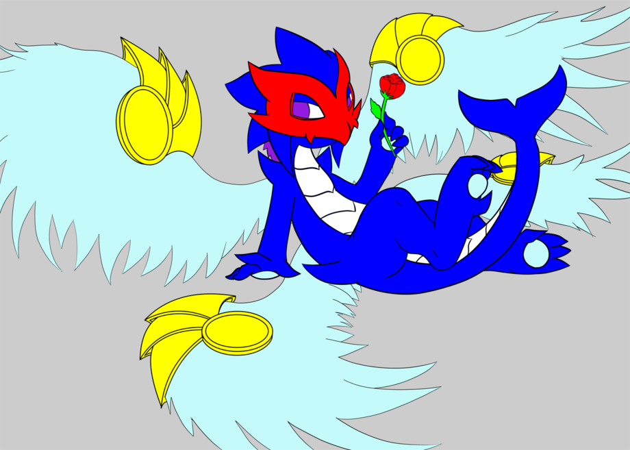 Xirevius is a Zwdyysgian, a polymorphic race that can transform any part of their body permanently until they return to their home planet to "reset". He usually wears a red mask for protection against "unnecessary" display of emotion (AKA blushing). The blue "spikes" on his head are his ears, the ear openings facing the rear and sharp in picking up various frequencies depending on which ear is open. His eyes and hair are both violet in color. His mouth houses a row of smooth conical teeth to pierce leather-like skin easily, his jaw akin to that of a dragon's. His neck is long to allow for flexible head movement whether he is on two feet or on all fours. One row of white plate-like scales line his underbelly, from base of chin to the tailtip, one section of his scale is inverted to make a secret pouch similar to a kangaroo's, possibly to carry the young, similar in trait as a seadragon. His tail extends as long as his body and is a finned like a whale or a dolphin's. His back sports two pairs of wings, pale sky in color and charged with electrical energy, the same with his cyan colored palm and foot pads.
