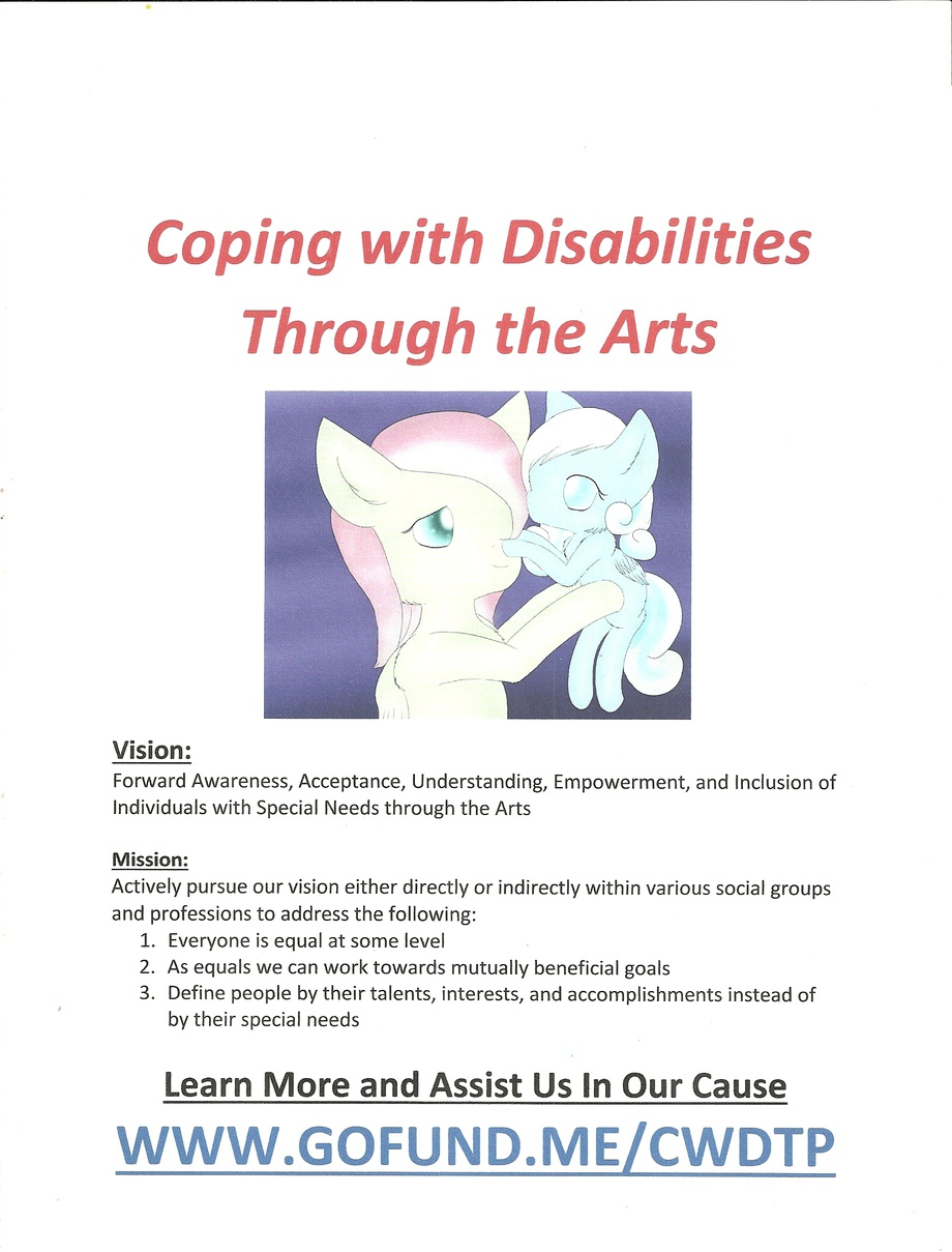 HISTORY: Coping with Disabilities Through the Arts (CWDTA) is a non-profit cause founded in December 2013 by Matthew S. Palumbo. Born with a congenital, degenerative, eye disease, Matthew turned to his love for writing as an outlet for expressing himself and his ideas. This eventually lead him to discover other people who, like him, have used the arts to cope with their special needs while finding acceptance, understanding, empowerment, and validation through the feedback of others who share their work. Noticing how so many people with special needs were being seen for their talents instead of their particular special need, CWDTA was born.