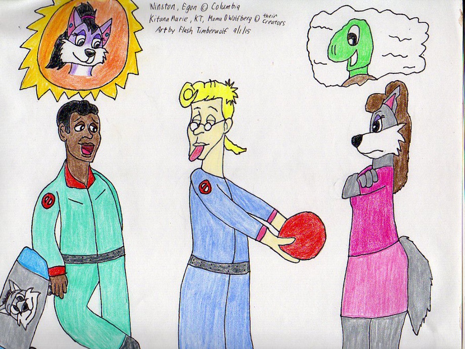 So...what did she have me draw THIS time? Here we have Egon and Winston dancing the tango in long underwear while colored pencils rain down hearts, lungs, and blood.