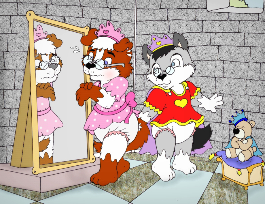 own ''personnal'' version and I quote: A chastity belt, a plug, and a diaper, a dog collar so she knows who she is, that how princesses should be dressed. Our wedding will be fabulous ! I quite sure that this ''version'' would be need to be seen ot drawn ... would be the most hilarious ''sequel'' of this drawing ... XD XD XD XD XD Héhé I'm quite sure that our li'l ''King plushie'' XD would approuve XD XD XD