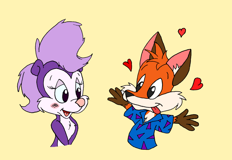 I scribbled this at the bottom of another drawing, but ended up liking it enough to give it ink and color. I wanted to convey what's going on through the emotion these two are showing. Fifi may chase skunk-hunks around all the time, but is unused to a boy showing just as much amour for her. She is surprised and flattered by Alex's attention, while he's simply elated to merely be in her lovely presence. ^__^