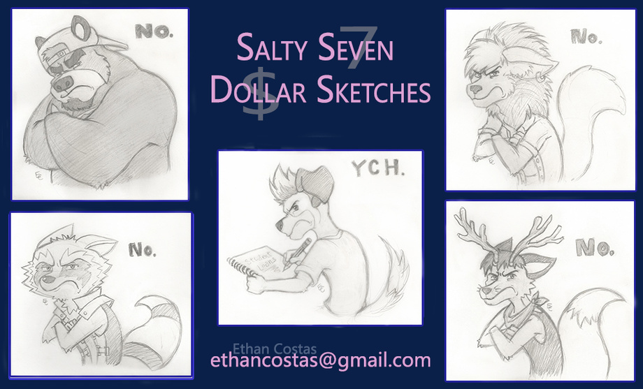 While at Califur 2015, chilling in the artist lounge, I drew one of my characters, Hunter (Top left), and came up with a fun little idea of doing a little commission series where I draw people's characters all "salty."