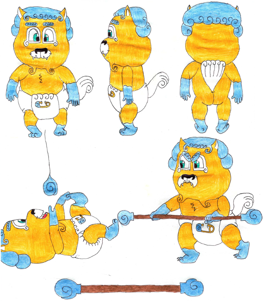 His designs are mostly remeniscent of the statues of what they are depicted in their native China where their are swirles on their body like their eye brows, hair, and even his cloth diaper has that on the folds. His weapon may appear to be spherical and blunt, bit upon closer examination, they are flat and very sharp, able to slice away at anything that even manages to pose it. Also, I got the idea of the weapon from the Playstation/ N64 game Nightmare Creatures