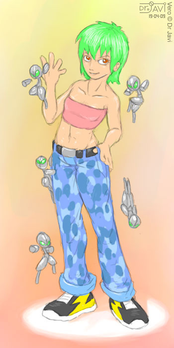 This is Verónica Falcata a.k.a. Vero, from Andalusia, able to cast all kind of experimental weaponry from a transdimensional storage at any time, as well as those little helpers which keep her arsenal working and tidy.