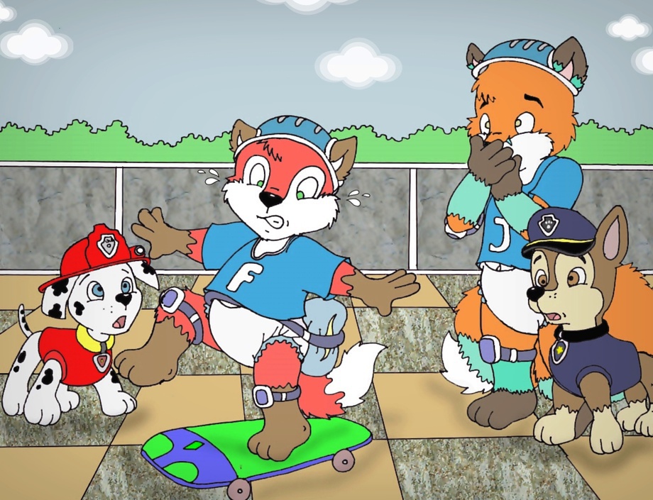 Marshall and Chase are teaching how to use the skateboard to Foxy and Jim!But it seems that Foxy is going to need a lot of practice(and Jim too), but at least he has a good pillow on his bottom in case he falls!
