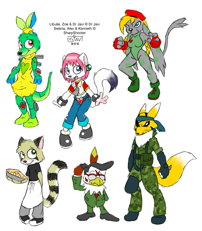 I see renamon cammy from street fighter above her and I think hawkmon the neat species you are dr javi holding the pie but other two not sure but happy and truly amazed by all of these creations