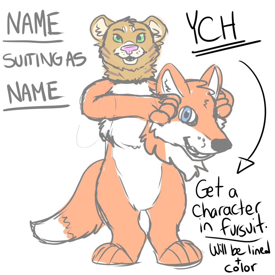 The final picture will have proper lineart and be flat coloured to match the characters. You can also have the name of the fursuiter and fursuit written as shown in the example. You can also of course, change the names to a twitter handle or FA name..etc